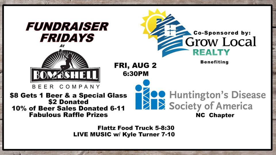Brought to you by Bombshell Beer and Grow Local Realty ! For $8 you get a special glass to keep & 1 beer, plus we donate $2 per sale. In addition to that sweet deal, we donate 10% of all pint sales 6:30 PM to close to the charity! A special raffle prize to be donated by Grow Local Realty owner Brian Hargrove. Live Music 7-10PM & Food Truck on Site 5-9!
