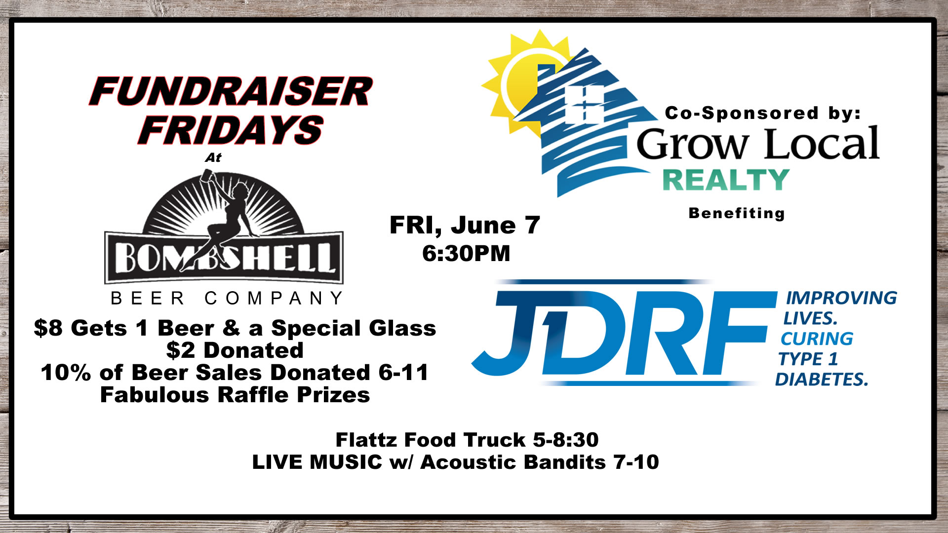 Brought to you by Bombshell Beer and Grow Local Realty ! For $8 you get a special glass to keep & 1 beer, plus we donate $2 per sale. In addition to that sweet deal, we donate 10% of all pint sales 6:30 PM to close to the charity! A special raffle prize to be donated by Grow Local Realty owner Brian Hargrove. Live Music 7-10PM & Food Truck on Site 5-9!