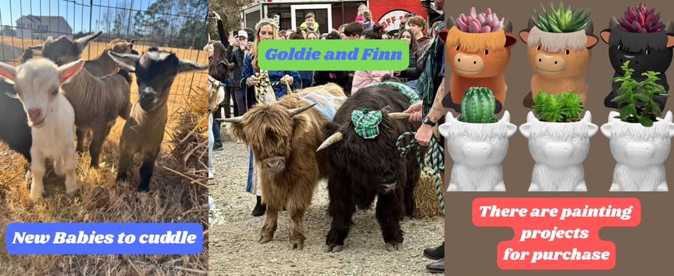 February 7th from 12-3. Finn and Goldie will be there celebrating their 1st Valentine’s together as a married couple! They will also bring their baby goat friends all dressed up!! Valentine’s photo opportunities with the crew!! We will also have Highland Cattle succulent planters to paint for $10 while supplies last!!