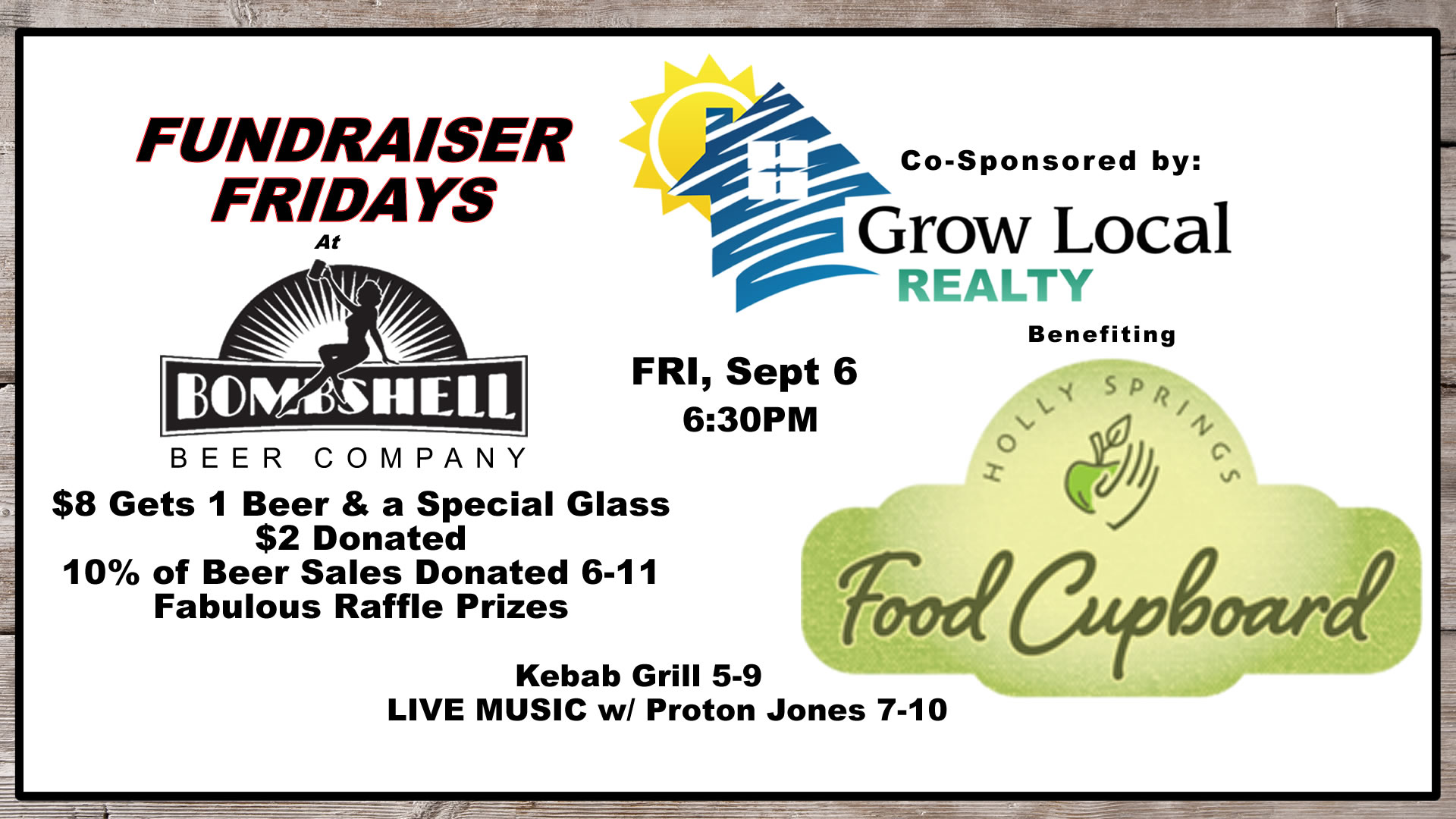 Brought to you by Bombshell Beer and Grow Local Realty ! For $8 you get a special glass to keep & 1 beer, plus we donate $2 per sale. In addition to that sweet deal, we donate 10% of all pint sales 6:30 PM to close to the charity! A special raffle prize to be donated by Grow Local Realty owner Brian Hargrove. Live Music 7-10PM & Food Truck on Site 5-9!